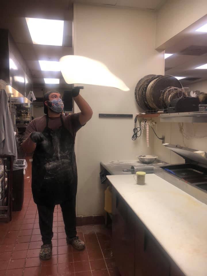This is a picture of me at work at the Rotllies Pizza and Pasta. I work mostly as a pizza cook and sometimes I dabble at working as a line cook. We have taken many extra precautions at work to help stop the spread. Everyone has a mask and gloves on. If you have never worked an oven with a facemask on let me tell you it is hot. We are working hard to keep the doors open and the support from our local community has been amazing. While we have been fortunate other businesses have fared far worse. There has been many businesses that cannot keep the doors open. Others have tried to open back up with the help of the government loans. These are strange times and we got to stick together.