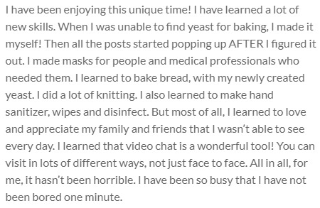 I have been enjoying this unique time! I have learned a lot of new skills. When I was unable to find yeast for baking, I made it myself! Then all the posts started popping up AFTER I figured it out. I made masks for people and medical professionals who needed them. I learned to bake bread, with my newly created yeast. I did a lot of knitting. I also learned to make hand sanitizer, wipes and disinfect. But most of all, I learned to love and appreciate my family and friends that I wasn’t able to see every day. I learned that video chat is a wonderful tool! You can visit in lots of different ways, not just face to face. All in all, for me, it hasn’t been horrible. I have been so busy that I have not been bored one minute.