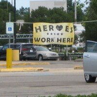 An electronic billboard at a shopping center along Maize Road in west Wichita, Kansas, encouraging citizens to weather the crisis and look forward to better days. The sign incorporates the city's emblem with a blue heart added in its center.