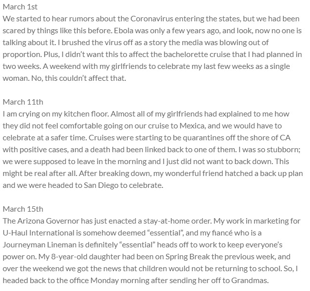 The Arizona Governor has just enacted a stay-at-home order. My work in marketing for U-Haul International is somehow deemed “essential”, and my fiancé who is a Journeyman Lineman is definitely “essential” heads off to work to keep everyone’s power on. My 8-year-old daughter had been on Spring Break the previous week, and over the weekend we got the news that children would not be returning to school. So, I headed back to the office Monday morning after sending her off to Grandmas.