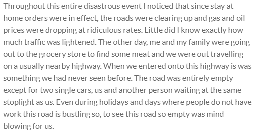 Throughout this entire disastrous event I noticed that since stay at home orders were in effect, the roads were clearing up and gas and oil prices were dropping at ridiculous rates. Little did I know exactly how much traffic was lightened. The other day, me and my family were going out to the grocery store to find some meat and we were out travelling on a usually nearby highway. When we entered onto this highway is was something we had never seen before. The road was entirely empty except for two single cars, us and another person waiting at the same stoplight as us. Even during holidays and days where people do not have work this road is bustling so, to see this road so empty was mind blowing for us.