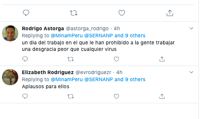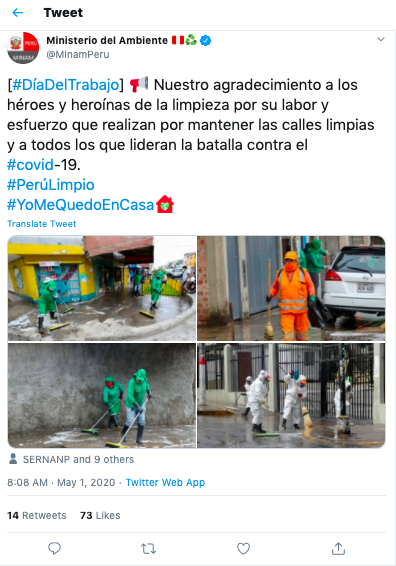 Un tweet de agradecimiento en reconocimiento del Día del trabajo. Reconoce la gente de limpieza que mantiene las calles limpias durante el COVID-19.