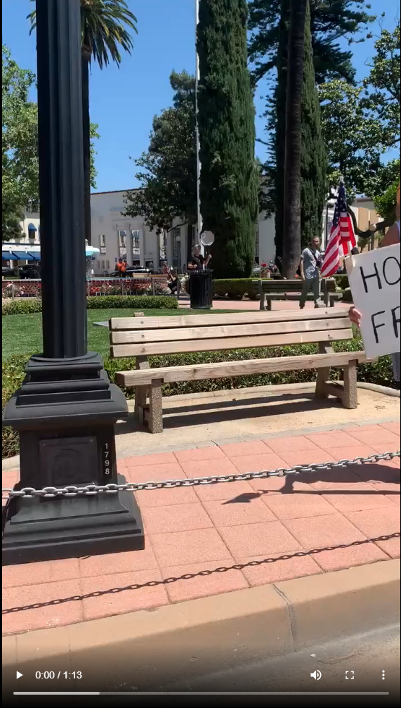 Protestors congregated in the main public plaza in the City of Orange, advocating for the ending of social distancing and a return to work. People drove by and honked their horns in agreement, or also engaged in debate with the protestors.