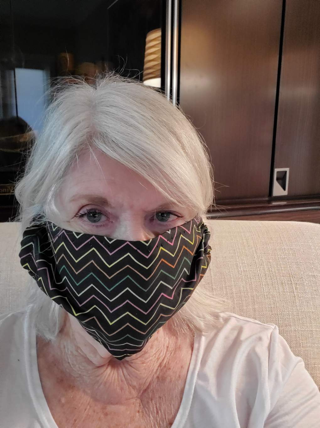 Me in 1 of my masks 2. another mask, 3. my work station, a.k.a. kitchen table, 4. me and my sewing machine, 5. Hospice of the Valley, 6. Arriving at reception area of Hospice, 7. Me with Lin Sue Cooney, Director of Community Engagement