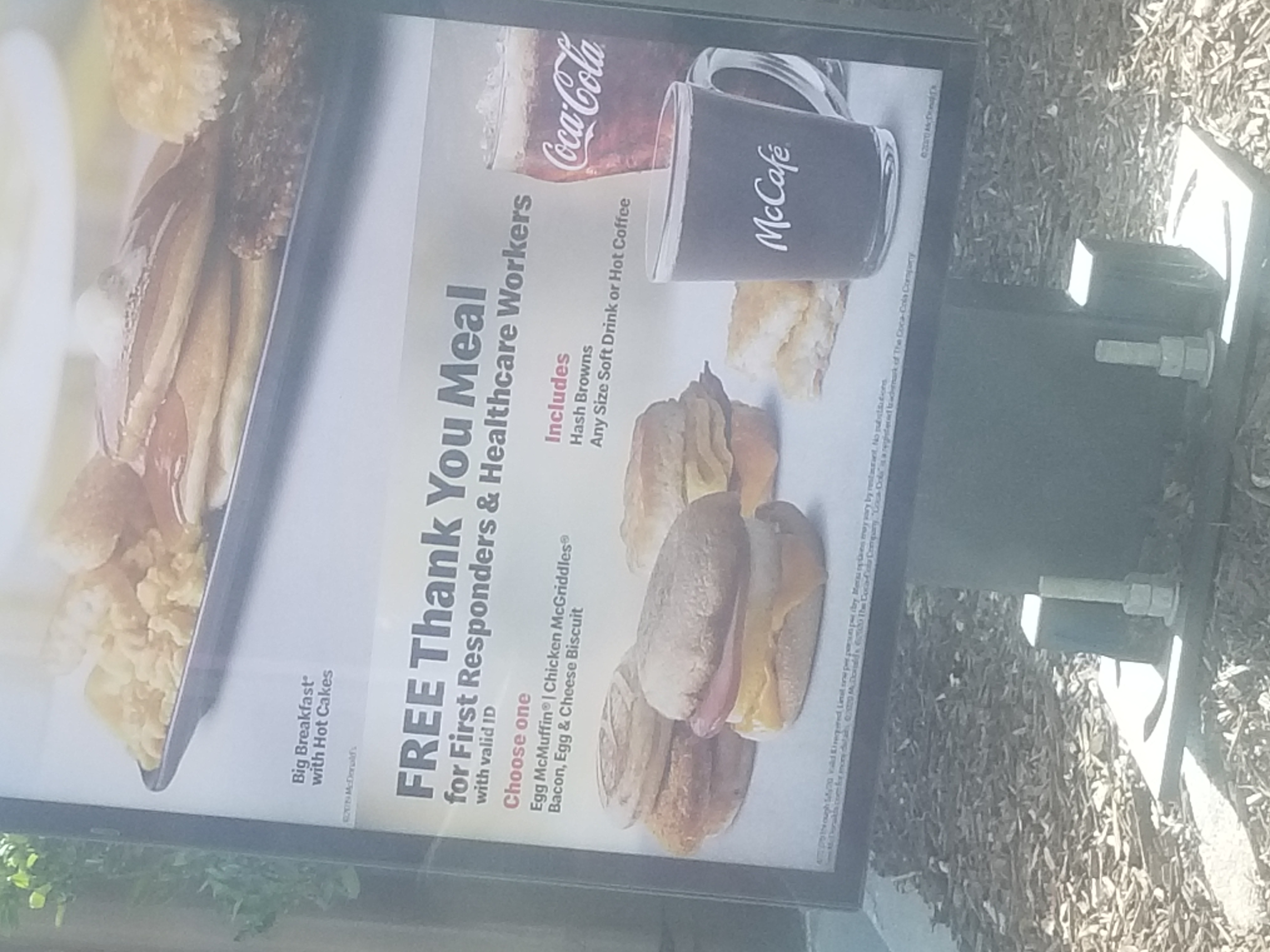 I had go to McDonalds to pick up breakfast when I noticed they had this sign in the drive thru. My Aunt is a nurse working in the Covid-19 unit at a local hospital. I took the picture of the sign to send to her. She was excited to see that they had such an offer. She was also suprised because she did not know that was something McDonalds was doing. She shared the information with her coworkers, whom most did also not know about that. I think it is important to share these kinds of offers for first responder. It's great that McDonalds is giving out free complete meals to the first responders, but it should be something that is more well known about. I am not sure if this is a local offer or a national one, but regardless The people who the offer is being made for should be made aware. I hope to see as time progresses more bigger chains that can afford programs like that to join and help us support all of the hard working first responders.