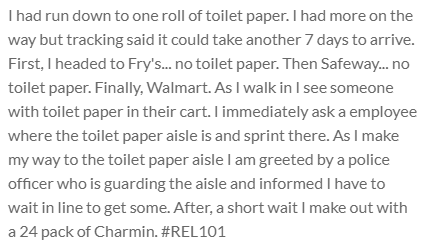 I had run down to one roll of toilet paper. I had more on the way but tracking said it could take another 7 days to arrive. First, I headed to Fry's... no toilet paper. Then Safeway... no toilet paper. Finally, Walmart. As I walk in I see someone with toilet paper in their cart. I immediately ask a employee where the toilet paper aisle is and sprint there. As I make my way to the toilet paper aisle I am greeted by a police officer who is guarding the aisle and informed I have to wait in line to get some. After, a short wait I make out with a 24 pack of Charmin. #REL101