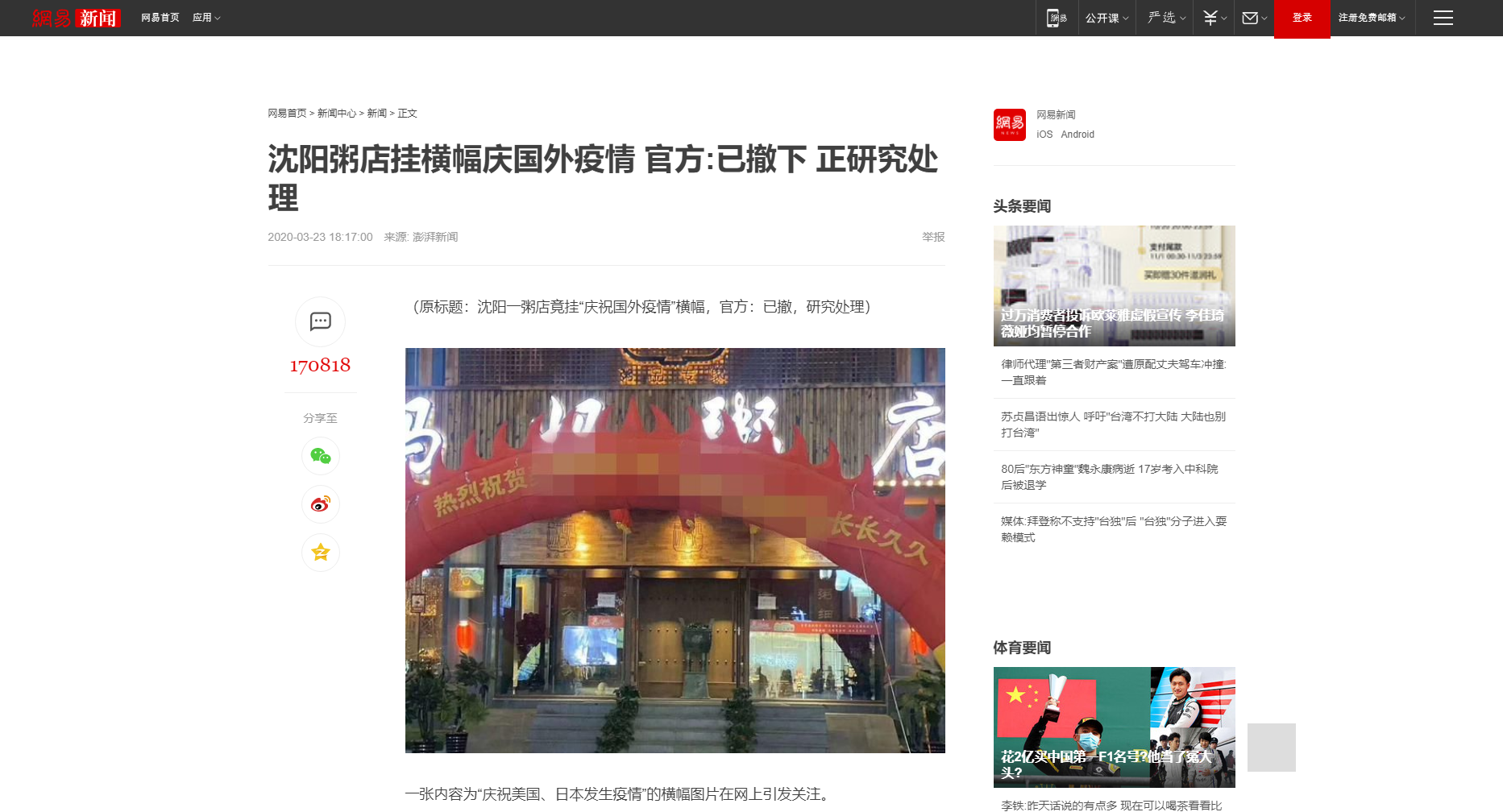 沈阳粥店挂横幅庆国外疫情 官方:已撤下 正研究处理