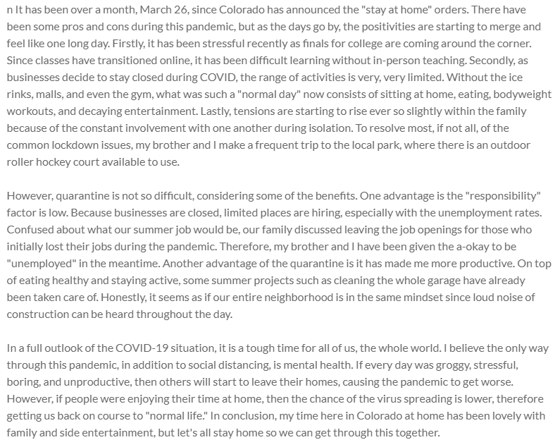 In a full outlook of the COVID-19 situation, it is a tough time for all of us, the whole world. I believe the only way through this pandemic, in addition to social distancing, is mental health. If every day was groggy, stressful, boring, and unproductive, then others will start to leave their homes, causing the pandemic to get worse. However, if people were enjoying their time at home, then the chance of the virus spreading is lower, therefore getting us back on course to "normal life." In conclusion, my time here in Colorado at home has been lovely with family and side entertainment, but let's all stay home so we can get through this together.