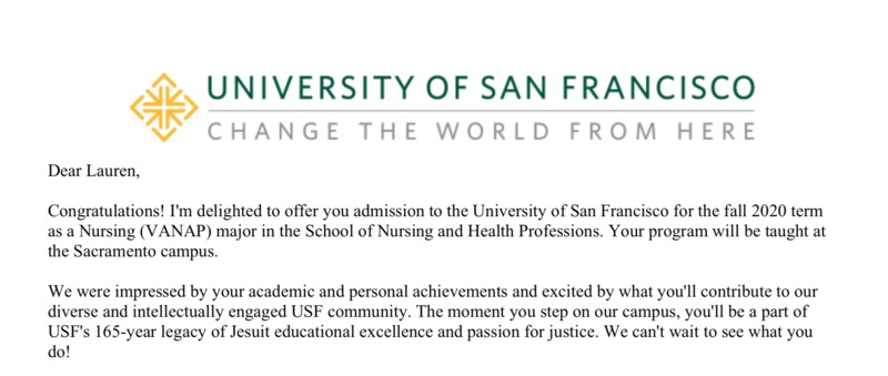 Attached you will find my admission letter to the School of Nursing and Health Professions at the University of San Francisco. Upon writing this entry, I have been admitted and secured my spot at the institution. I was admitted approximately one month ago, during the crisis itself. This photo of my admission letter is beyond meaningful to me even more so because of the circumstances we all are now facing. My passion for nursing has always been the driving force for how I conduct my school efforts. Despite my extensive family size, I actually am one of the first to enter the medical profession. I was inspired to enter into this field in high school when I shadowed a fellow family friend. I visited her at the Mercy San Juan Neonatal Intensive Care Unit and immediately was drawn to this unit. From that day, I never could consider any other field of study. I am in continuous awe of those on the frontlines, especially nurses and doctors. Upon admission to nursing school, typically clinicals would be a part of one’s first-semester curriculum. Due to the pandemic, my clinicals have actually been pushed back an additional semester. With nursing school especially, and the current incoming cohorts curriculum has drastically shifted. I point this out because no matter how big or small, in some way each of our lives has been changed by this event. At this point, I'm unaware if even my first semester will be held on campus. There is a rather high chance I will be online for my first semester of nursing school. All of our lives right now are for lack of a better word “tentative”, who knows how things will change or when things will resolve to normalcy. #CSUS #HIST15H