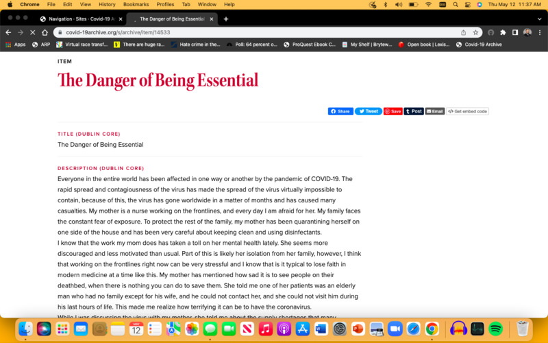 I know that the work my mom does has taken a toll on her mental health lately. She seems more discouraged and less motivated than usual. Part of this is likely her isolation from her family, however, I think that working on the frontlines right now can be very stressful and I know that is it typical to lose faith in modern medicine at a time like this. My mother has mentioned how sad it is to see people on their deathbed, when there is nothing you can do to save them. She told me one of her patients was an elderly man who had no family except for his wife, and he could not contact her, and she could not visit him during his last hours of life. This made me realize how terrifying it can be to have the coronavirus.