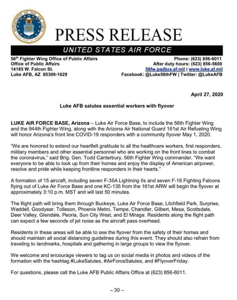 Luke Air Force Base in Phoenix, Arizona, issued this press release. They performed a flyover with 15 aircraft that followed a route that encompassed the entire valley. They encourage people to not gather in areas to watch the flyover, but to stay in their homes.