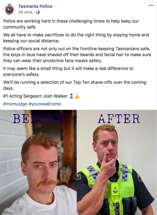 The image is a screenshot of the Tasmania Police Top Ten Shave Offs. This is one in a series of ten images which depict Tasmania Police Officers who have had to shave off their facial hair in order to wear protective personal equipment safely.
