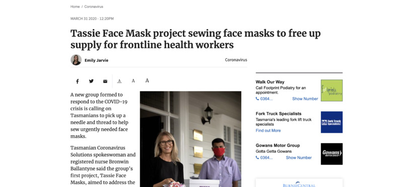 HUM402 The local community getting together for positive action against COVID-19. By sewing masks it's giving the broader community an active way to be involved as well as reducing stress on the low stocks of protective equipment.