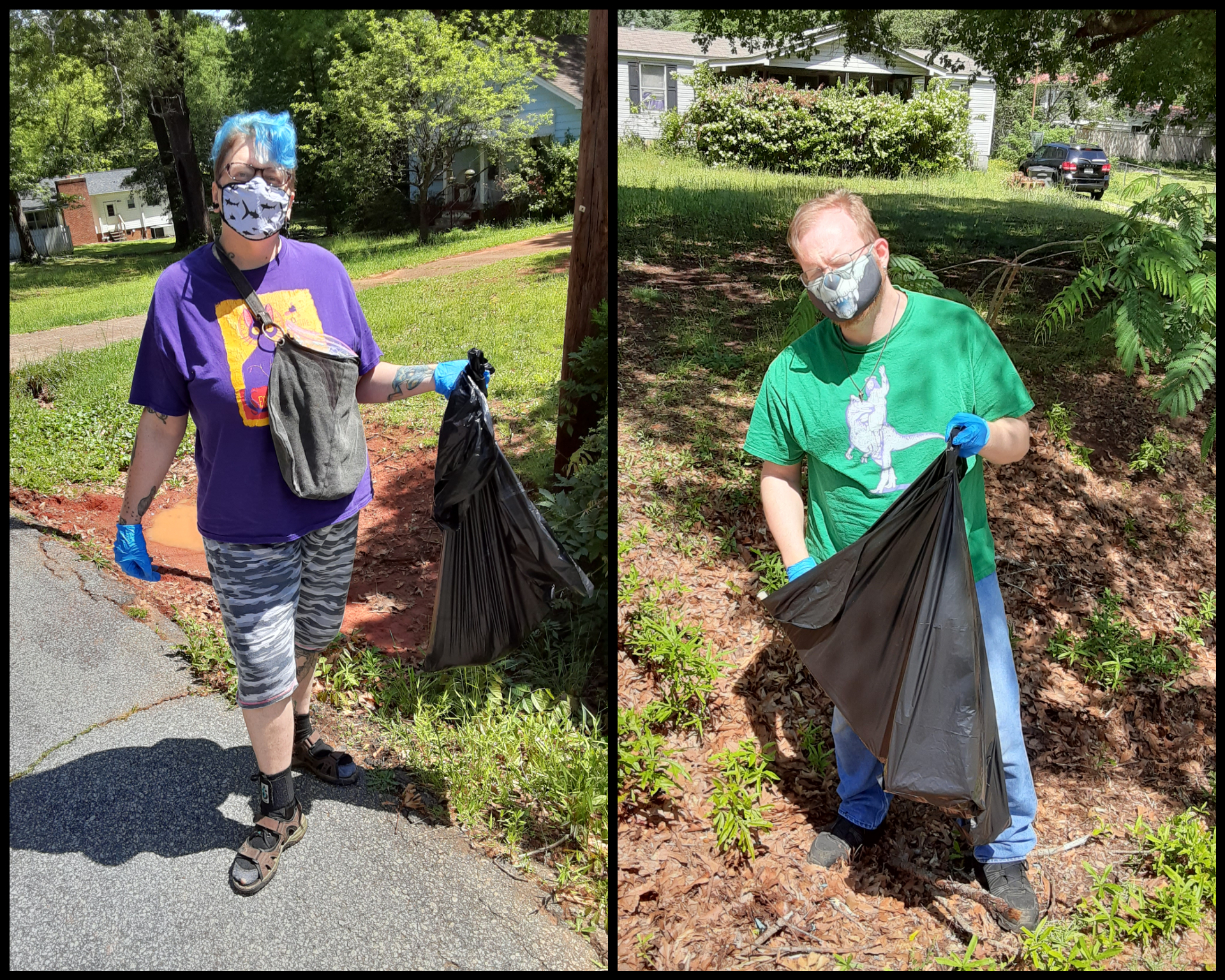 Photos of my partner and I picking up litter in our Taylors, SC neighborhood during our walk. We wear masks to go out and walk in the neighborhood no matter what but add gloves if we plan to pick up litter.
