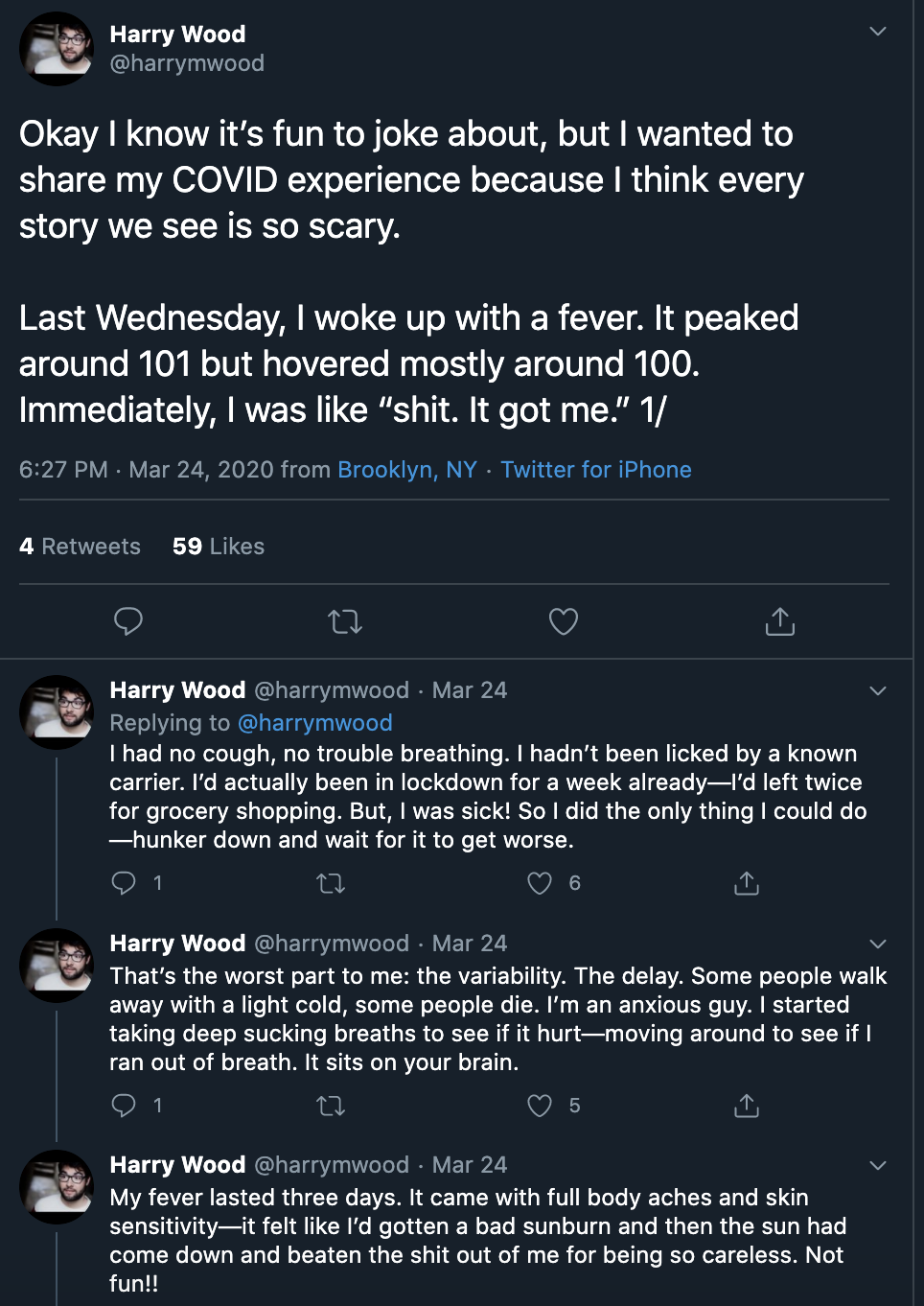 A Twitter thread sharing a personal experience with COVID-19. People have turned to Twitter to speak about their experiences with COVID because they are able to reach a larger audience. Harry explains what it was like at the beginning of getting sick and he also explained how he wasn't able to get tested. The fact that so many people had it or have it and aren't getting tested makes some of the numbers look better than they are.