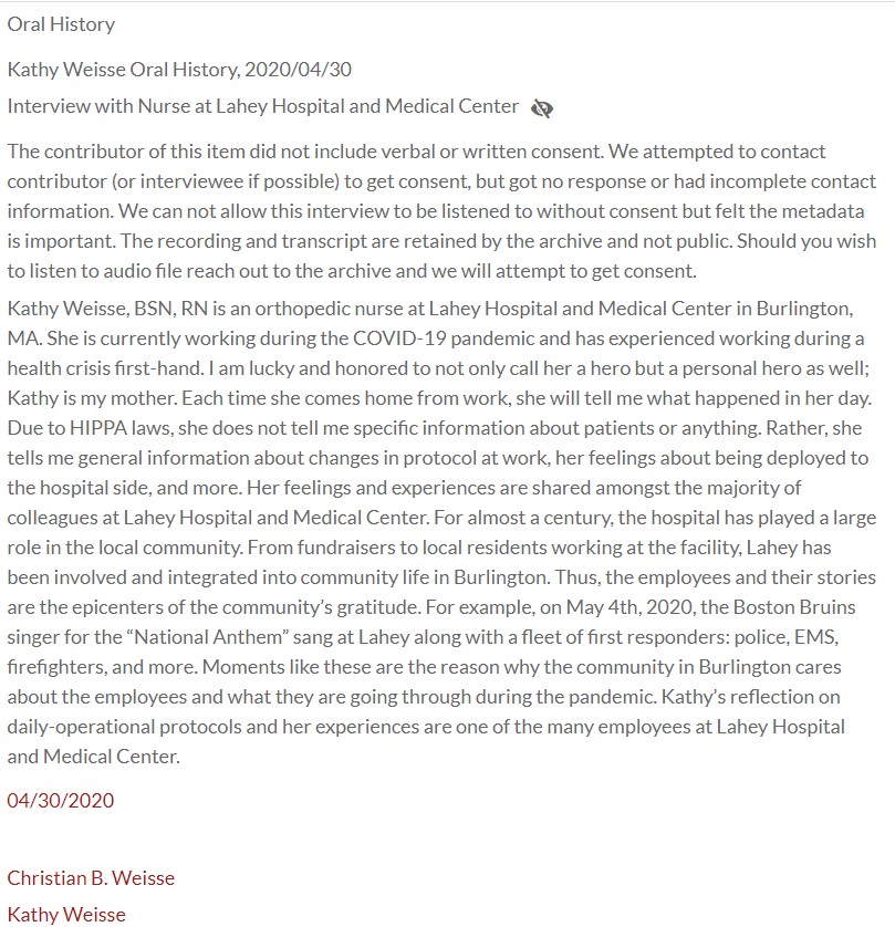 Kathy Weisse, BSN, RN is an orthopedic nurse at Lahey Hospital and Medical Center in Burlington, MA. She is currently working during the COVID-19 pandemic and has experienced working during a health crisis first-hand. I am lucky and honored to not only call her a hero but a personal hero as well; Kathy is my mother. Each time she comes home from work, she will tell me what happened in her day. Due to HIPPA laws, she does not tell me specific information about patients or anything. Rather, she tells me general information about changes in protocol at work, her feelings about being deployed to the hospital side, and more. Her feelings and experiences are shared amongst the majority of colleagues at Lahey Hospital and Medical Center. For almost a century, the hospital has played a large role in the local community. From fundraisers to local residents working at the facility, Lahey has been involved and integrated into community life in Burlington. Thus, the employees and their stories are the epicenters of the community’s gratitude. For example, on May 4th, 2020, the Boston Bruins singer for the “National Anthem” sang at Lahey along with a fleet of first responders: police, EMS, firefighters, and more. Moments like these are the reason why the community in Burlington cares about the employees and what they are going through during the pandemic. Kathy’s reflection on daily-operational protocols and her experiences are one of the many employees at Lahey Hospital and Medical Center.