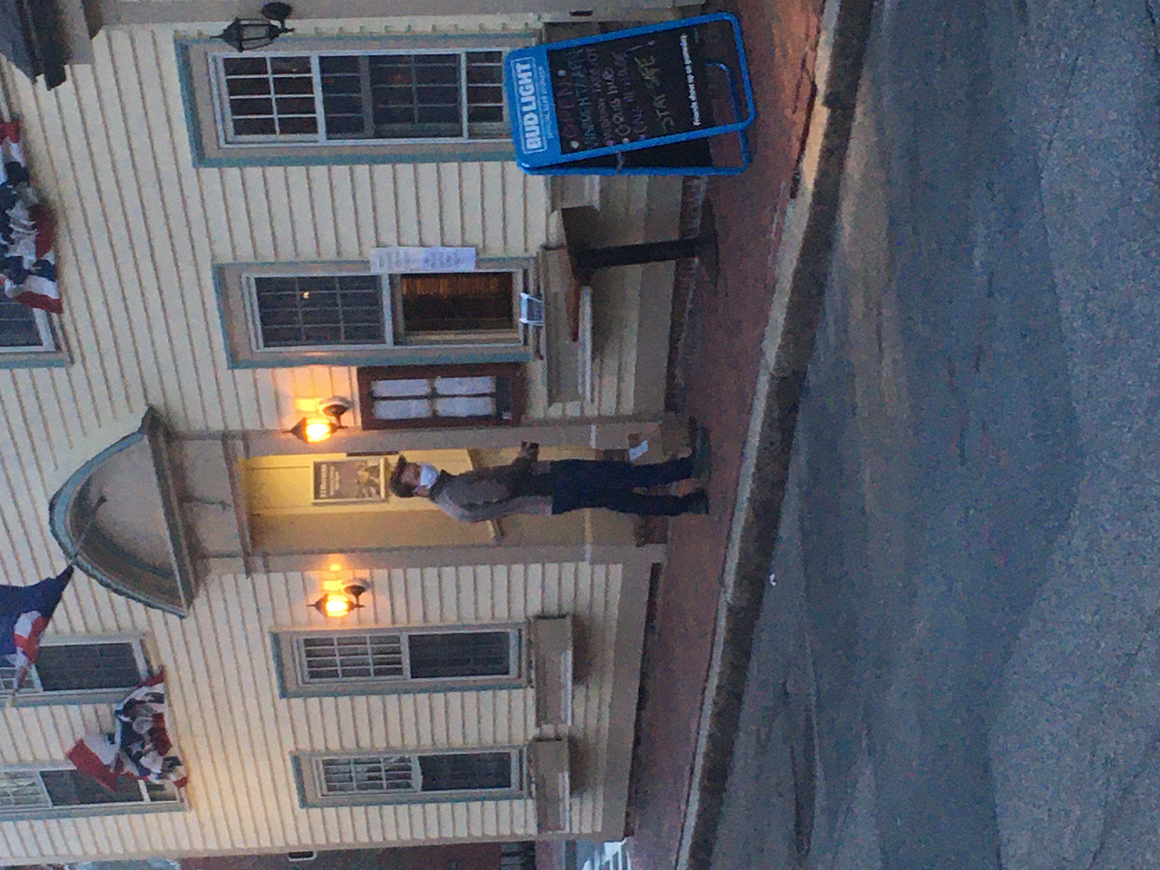 Color image of masked man doing contactless takeout pickup during COVID-29 pandemic. Warren Tavern, Charlestown, MA