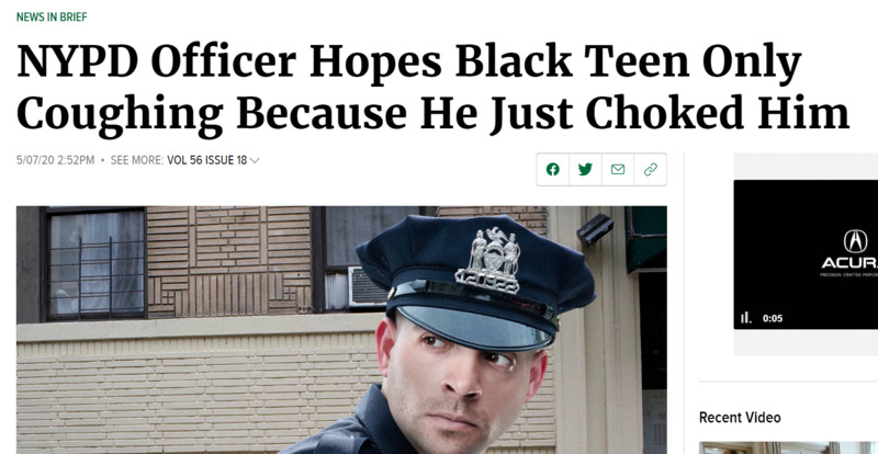 Black jogger Ahmaud Arbery and a series of police shootings in Indianapolis that left three people dead just hours apart, reports from New York show that social distancing arrests have overwhelmingly and disproportionately impacted Black New Yorkers. This satirical article from the Onion, perhaps America's most well known satirical paper, uses dark and gratuitous satire to criticize police brutality in the time of COVID. Perhaps the most devastating line in the entire article is a quote from a fictional officer who says, "I promised my wife and kids that until this pandemic is behind us, I would just shoot black teens from a safe distance."