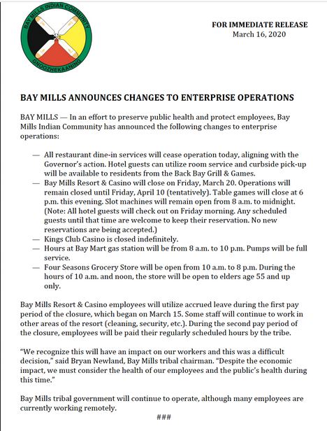 Announcement on changes to tribal business operations during quarantine. “We recognize this will have an impact on our workers and this was a difficult decision,” said Bryan Newland, Bay Mills tribal chairman. “Despite the economic impact, we must consider the health of our employees and the public’s health during this time.”