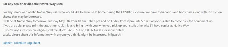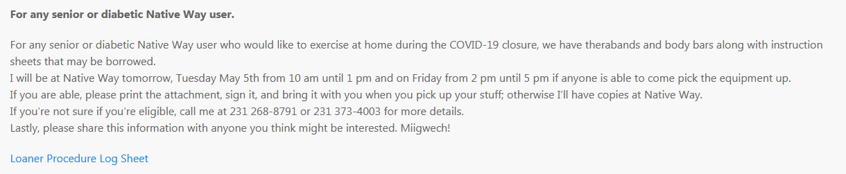 "For any senior or diabetic Native Way user who would like to exercise at home during the COVID-19 closure, we have therabands and body bars along with instruction sheets that may be borrowed." #IndigenousStories