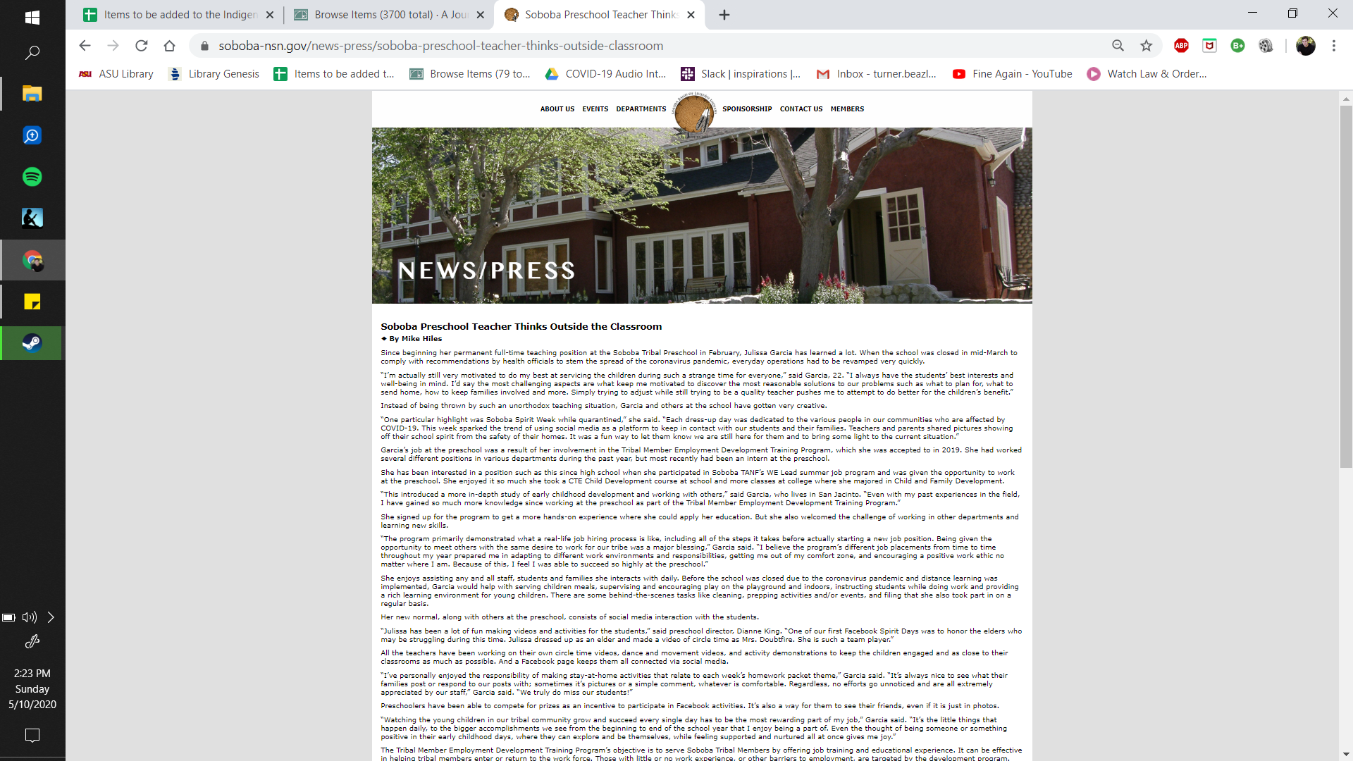 “Instead of being thrown by such an unorthodox teaching situation, Julissa Garcia and others at the school have gotten very creative. ‘One particular highlight was Soboba Spirit Week while quarantined,’ she said. ‘Each dress-up day was dedicated to the various people in our communities who are affected by COVID-19.” One of the first dress-up days was to honor the elders who had been struggling. “Julissa dressed up as an elder and made a video of circle time as Mrs. Doubtfire. She is such a team player.”