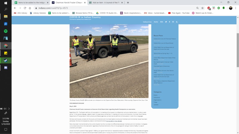 South Dakota governor threatens tribe with legal action unless they remove reservation checkpoints. Cheyenne River Sioux chairman responded with a press release, citing that it is a sovereign right of the tribe to protect it's people and "We will not apologize for being an island of safety in a sea of uncertainty and death."