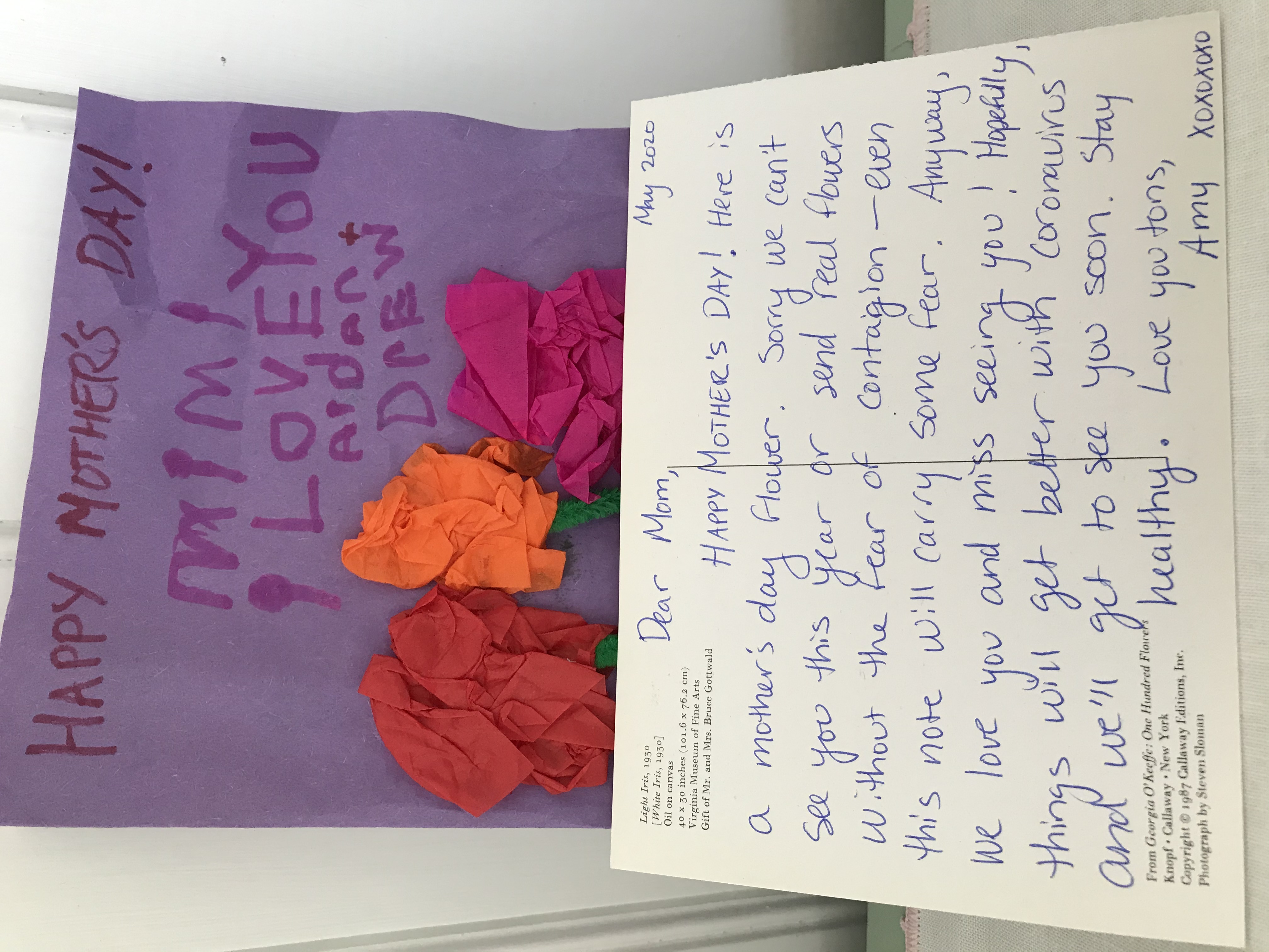 My daughter wrote this note expressing the fears around the virus, why she didn’t send flowers, and even a note is scary now, fear of contagion. My grandsons made the card.