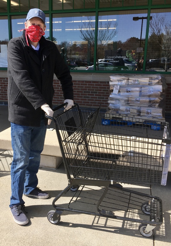 My husband wearing a DIY cloth mask in line outside the local Shaws market - Cohasset, MA