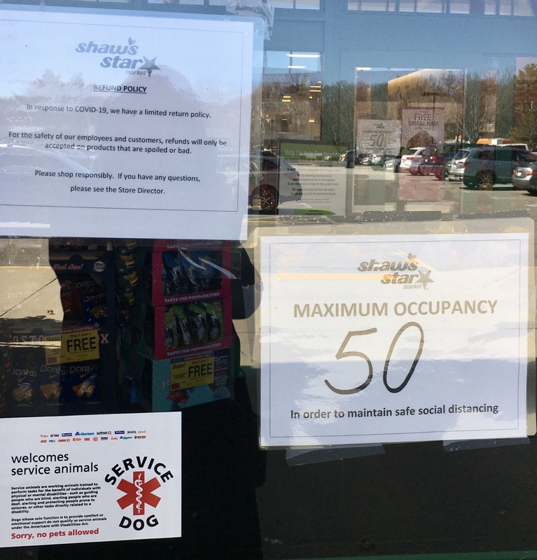 Image of notice at local Shaws market restricting occupancy to a max of 50 shoppers at a time.