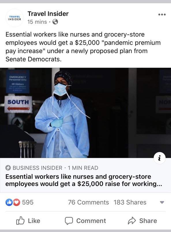 This project aims to document the treatment and reactions to the treatment of the essential workers during this pandemic. This is the headline of an article describing A proposed plan by the Senate Democrats which would increase the pay of essential workers who are more exposed to the virus during this pandemic