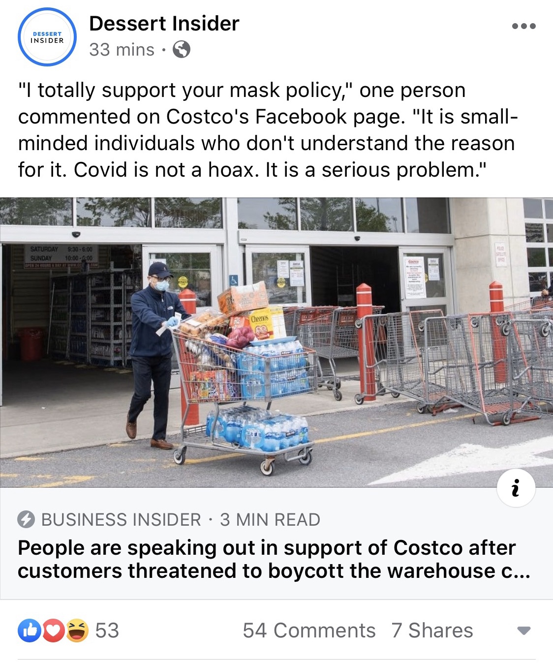 This project aims to document the treatment and reactions to the treatment of the essential workers during this pandemic. This is the headline of an article describing the reaction some customers wanting to protest and boycott Costco after their implementation of making it necessary to wear a mask. Many people have come to the defense of Costco saying that they support this act