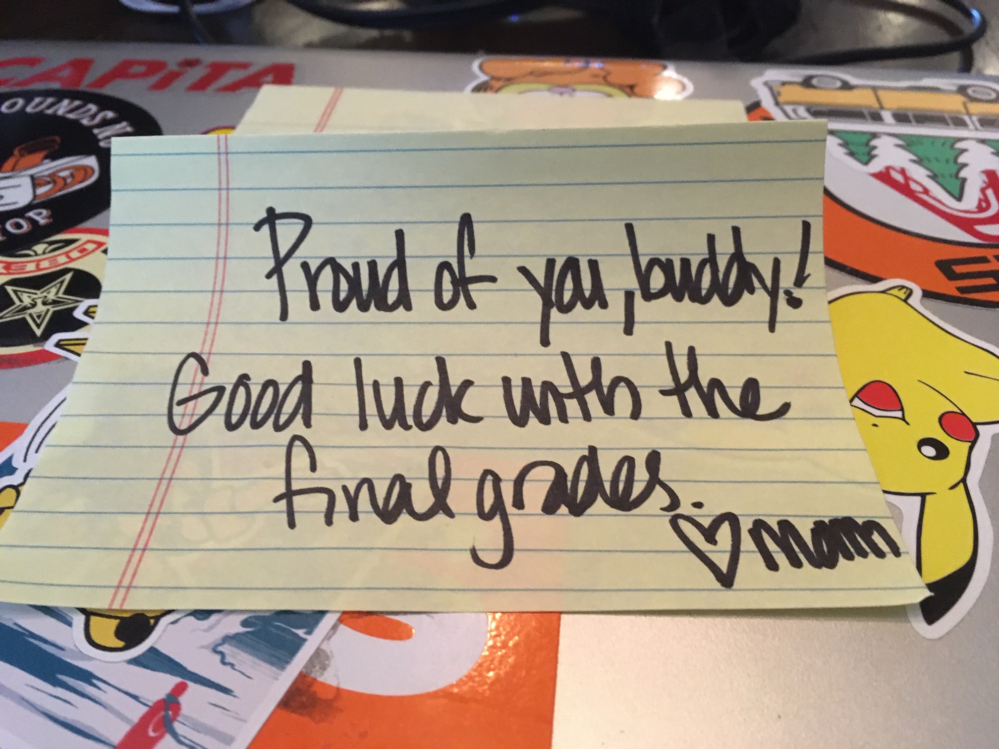 The COVID-19 virus disrupts life, particularly our relationships with those we love. But, relationships are flexible and adapt to circumstance. My brother's economics professor has not posted his final grade, yet. Remote learning creates many opportunities for students to violate the academic integrity policies of their schools, and my brother's class was no exception. Due to several perceived violations on the final exam, his professor delayed the posting of all final grades. In other words, although he did not cheat, he had to sweat it out with everyone else. My mother knew he was worried and wanted to leave him with some encouragement in the morning, so she left this note on his laptop before she left for work. We don't see her in the morning anymore, but my mom is always there for us.