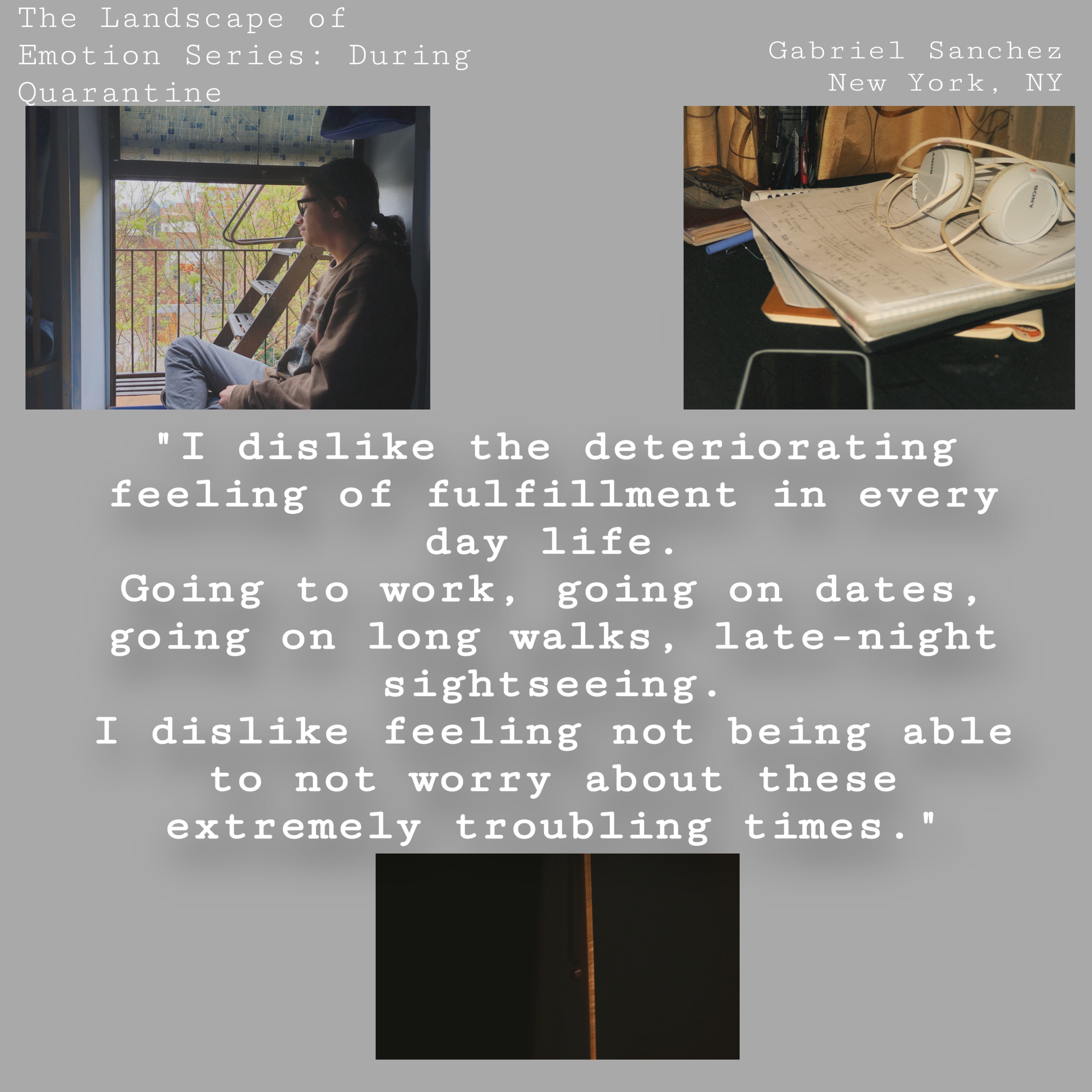 The Landscape of Emotion Series: Under Quarantine is a series illustrating the diverse experiences of mental health and feelings throughout quarantine. Gabriel Sanchez, my significant other, American Eagle worker, and incredible individual explains what he dislikes the most about quarantine. He portrays that it is completely acceptable and human to dislike what is happening