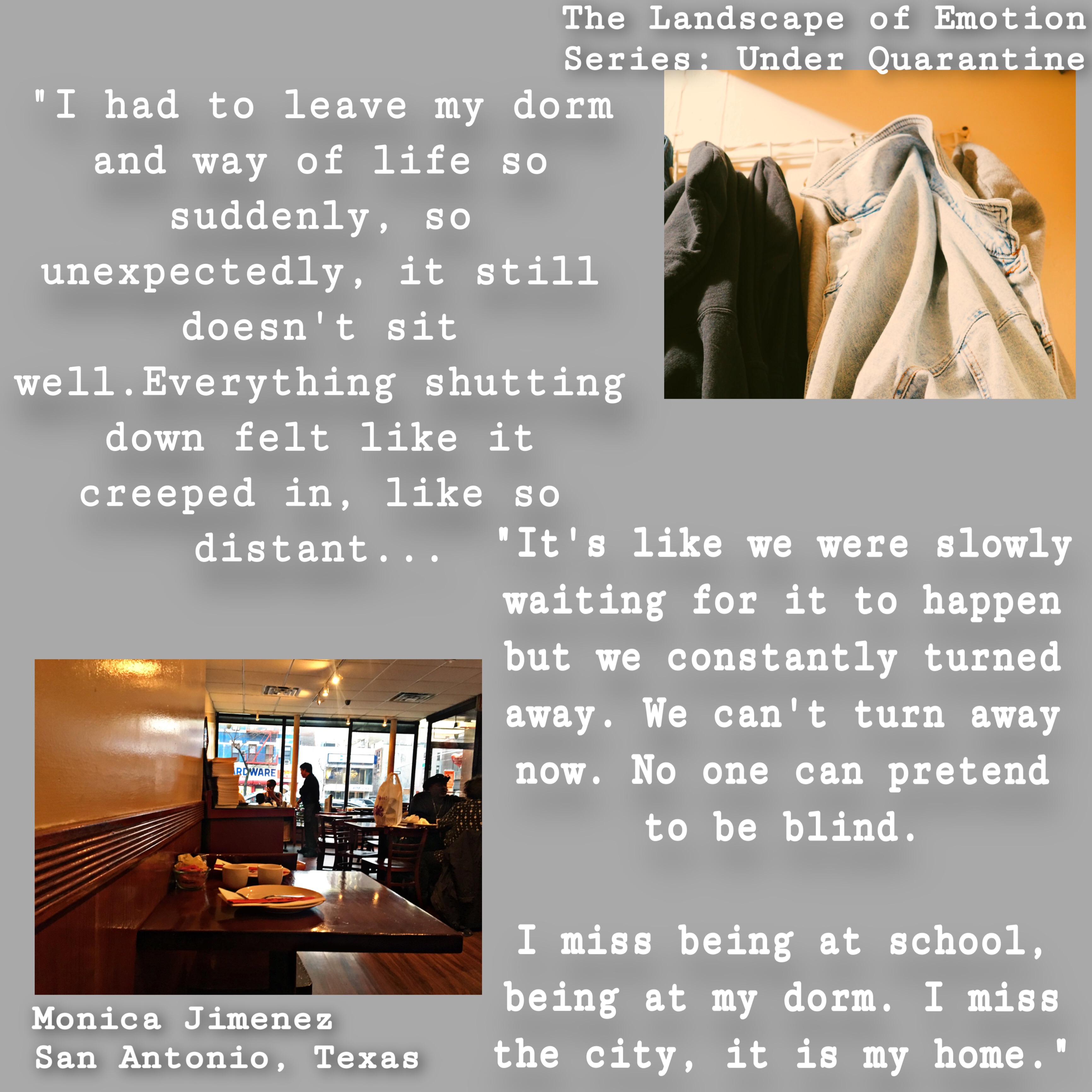 The Landscape of Emotion Series: Under Quarantine is a series illustrating the diverse experiences of mental health and feelings throughout quarantine. Monica Jimenez describes how her way of life was changed immediately after being told to return home.
