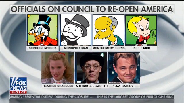 This meme is a political satire on what the major players in our capitalist economy are pushing for currently. By making the people the most money focused cartoon/movie characters commonly known, it points to the surreal nature of people pushing to go back to regular time when we aren't ready.