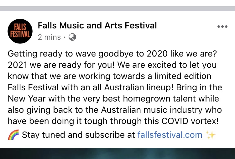 This is a screenshot of Australian music festival, Falls Festival, announcing to their followers that they are endeavoring to put on the festival at the end of the year, as per usual