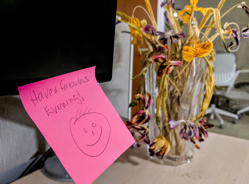 Photograph of an abandoned desk at an unnamed financial office after two weeks of quarantine, with a vase of dead flowers and an ironically cheerful post-it note.