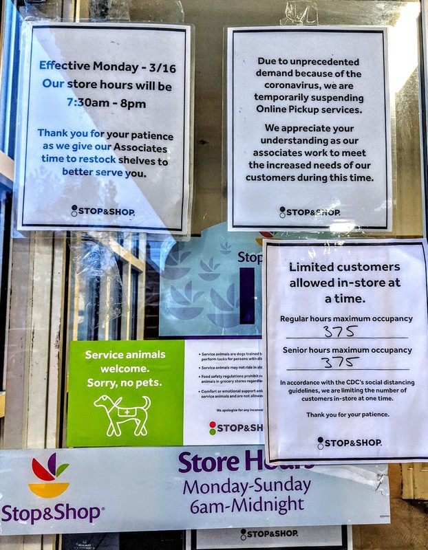 Photograph of the entrance to the Stop and Shop grocery store in Quincy, MA with signs posted about Coronavirus preventative measures.