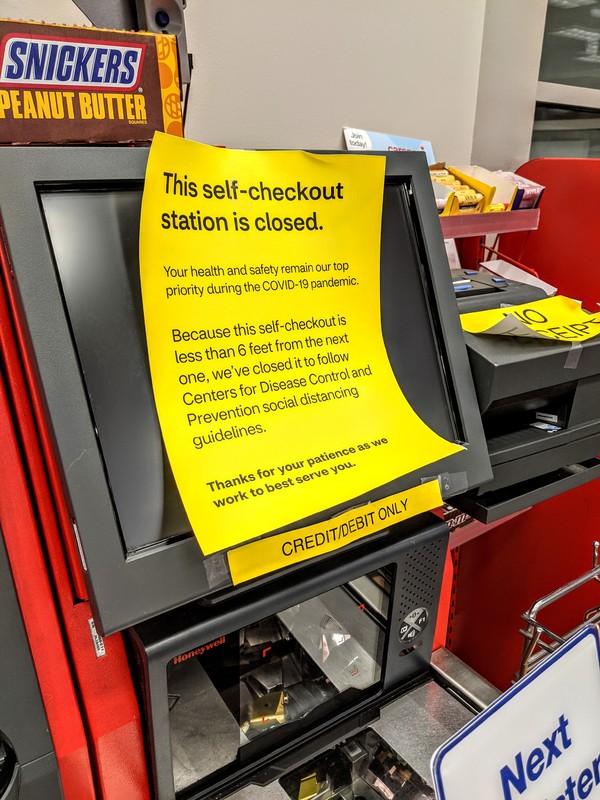 Photograph of a self checkout machine at CVS, indicating that it is out of service due to spacing of less than 6 feet between machines, as required by the Covid19 restriction.