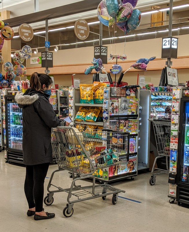 Photograph of a woman wearing a protective face mask while waiting at the checkout line at Stop and Shop during the Covid19 outbreak.