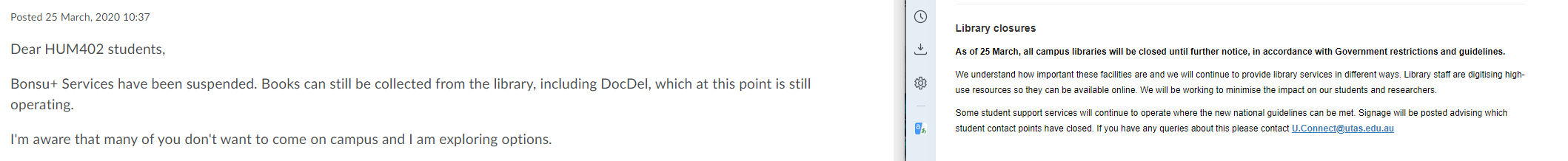 This is two announcements concerning the status of the Utas Libraries; the one on the left is an announcement by a teacher which says that said the Morris Miller library was still open for picking up books, actually going into the library had been suspended by that point. Later that same day the University published an official statement that announced the total closure of the library. This was in keeping with government restrictions and guidelines, many libraries had been closed. This article also helps display the difficulty that some students have been experiencing in acquiring sources for their study have been made more difficult, especially since browsing is impossible, as a student can't go into the library and search the section of the library for relevant resources. This source also shows a way that educational institutions attempt to help students by scanning resources so that students can access high-use materials.