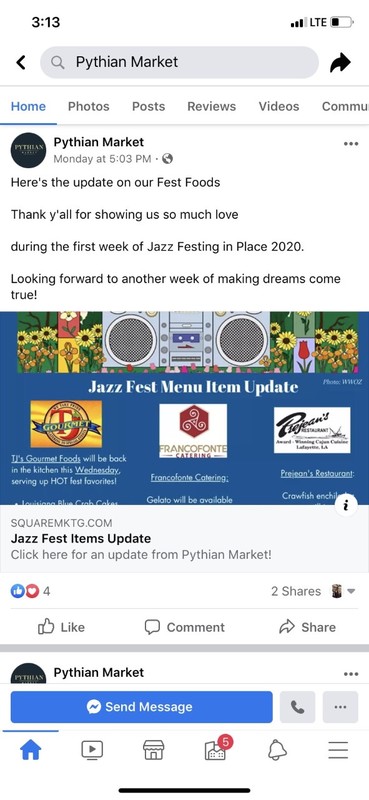 The Pythian Market offers new menu items for the Jazz Fest in Place event and thanks for support from the community.