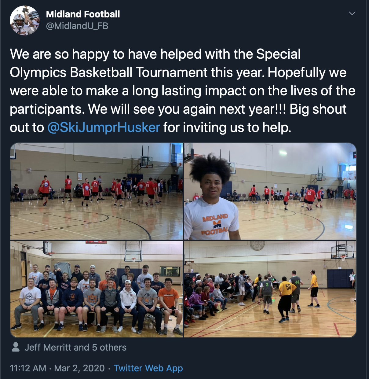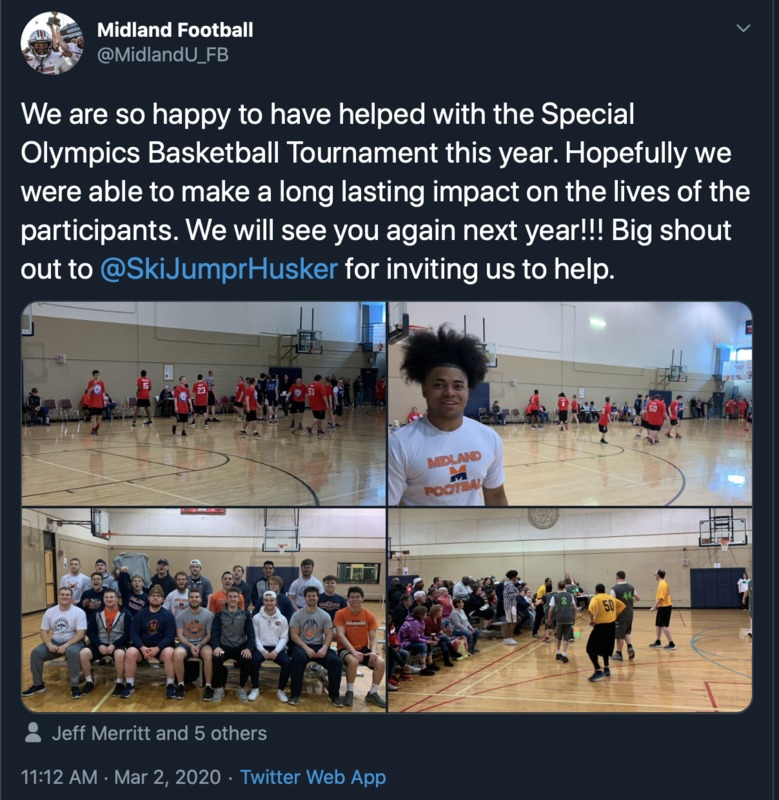 This was a series of pictures that My football team posted at the Special Olympics basketball tournament that my football team volunteered at. No less than a week after this event, an article came out in the Fremont tribune saying that there was a player at the event who had just tested positive for Covid-19. Following this news me and the rest of my teammates had to self quarantine for a week. This was tough for us players and our coaches because many of my teammates lived on campus and did not have access to a kitchen to cook food. But thankfully our coaches were able to bring everyone quarantined food one a day during our week long Quarantine.