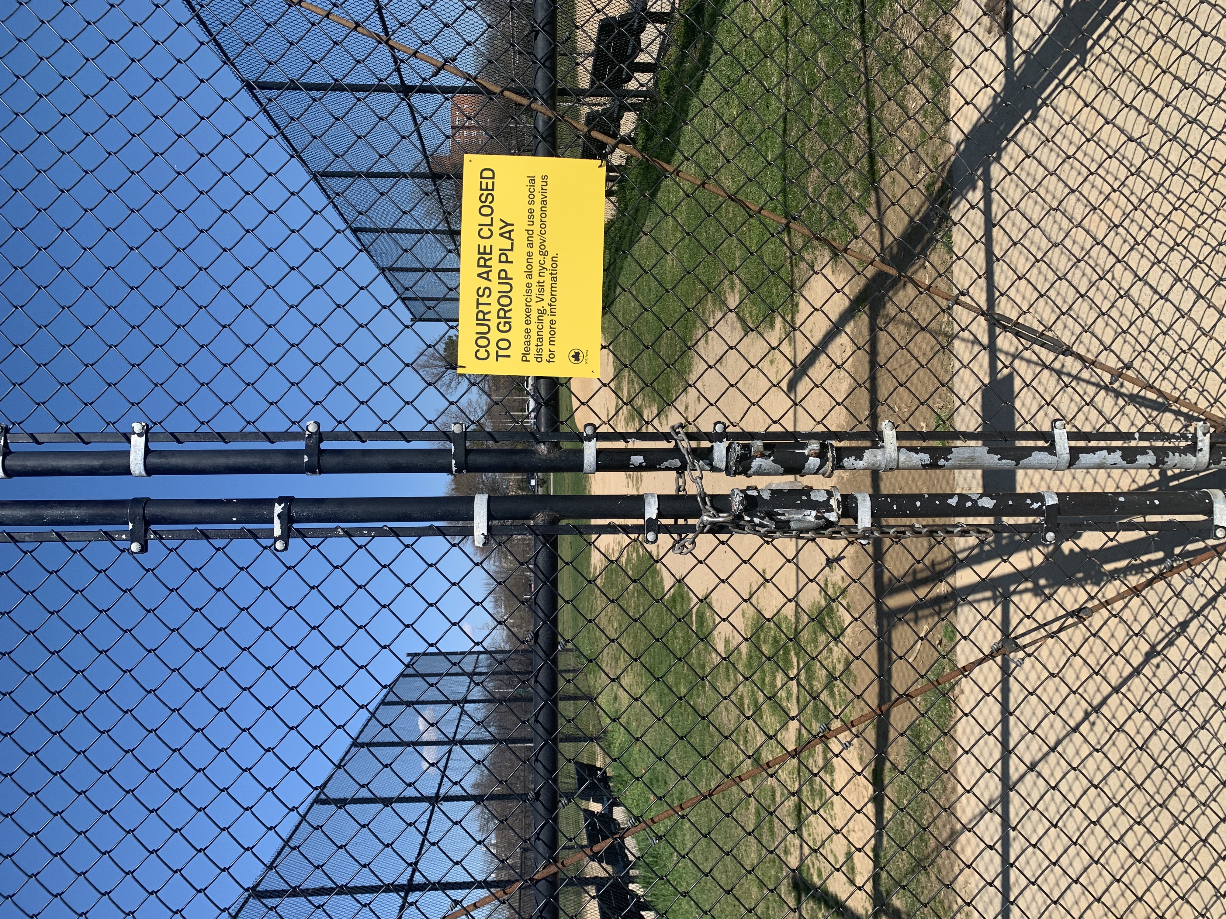 Walking along Shore Parkway, I see a locked gate and sign informing the public that playing in groups is not permitted.