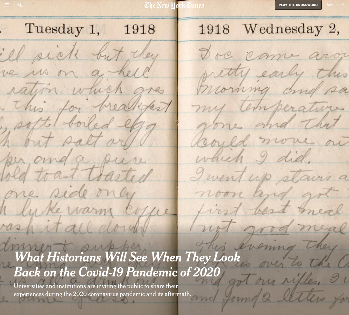 Universities, archives and historical societies, ranging from the Smithsonian’s National Museum of American History to a tiny college radio station in Pennsylvania, are rushing to collect and curate the personal accounts of how people are experiencing this sprawling public health crisis as told in letters and journals, audio and video oral histories, and on social media.