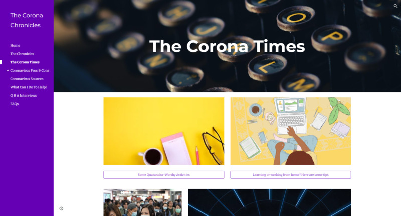 This is a Google Sites website that I made about the coronavirus with my experiences, feelings, thoughts, information on Covid-19, and interviews. It was originally a school project, however I have expanded on it much more since.