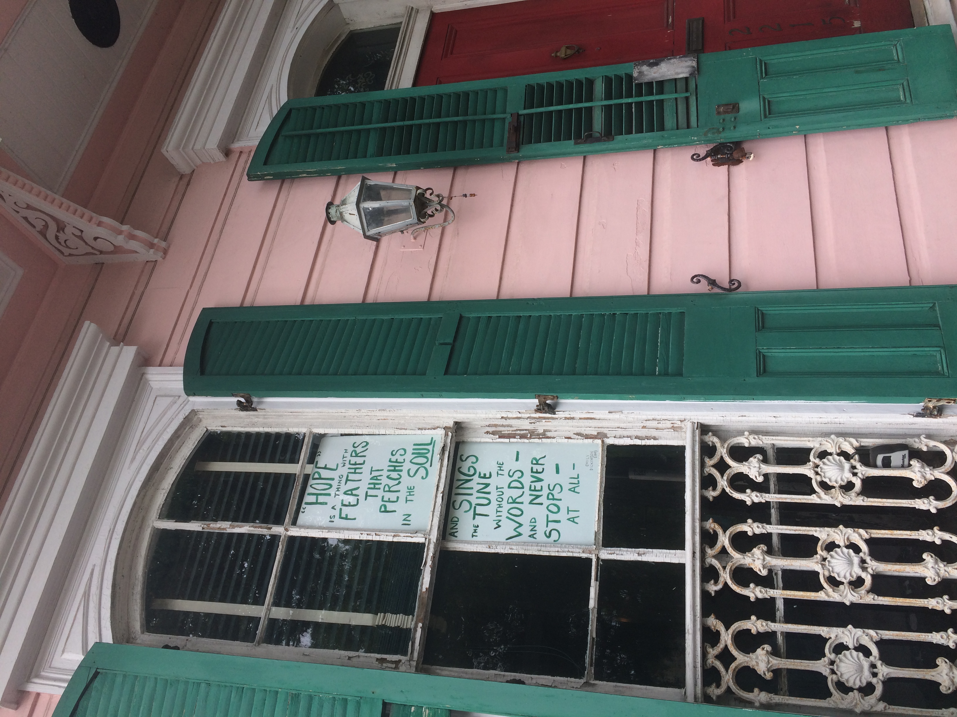 During the stay-at-home order, many people have decorated their homes or hung signage as a way to connect with other people in the neighborhood. This house is the Marigny neighborhood features the following quote from Emly Dickinson: "Hope is a thing with feathers that perches in the soul and sings the tune without the words- and never stops- at all-"