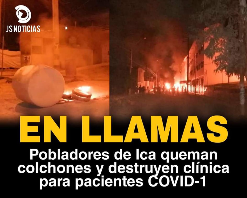 POBLADORES DE ICA QUEMAN Y DESTRUYEN COLCHONES Y DAÑAN CLINICA DESTINA PARA PACIENTES COVID-19.