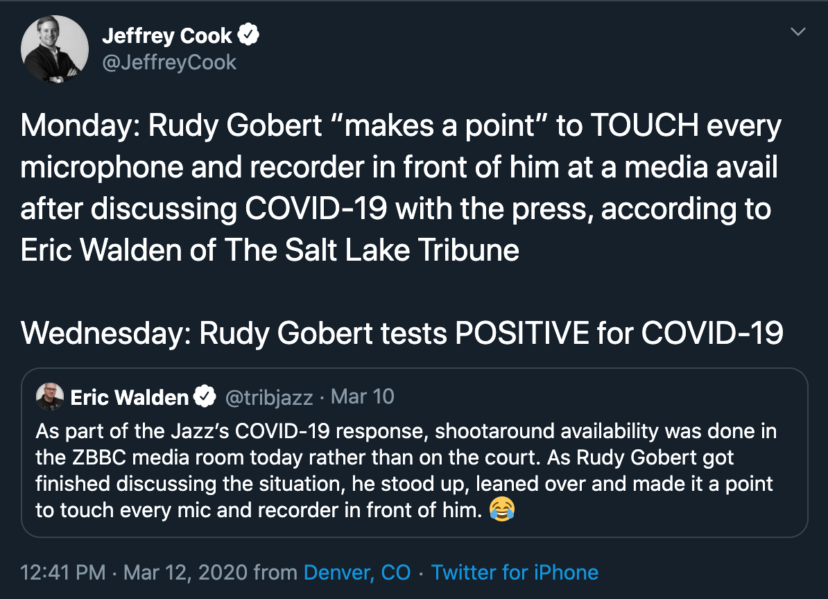 In March, during the early days of the COVID-19 outbreak reaching Europe, Australia, and the USA, some people were still taking the risk less seriously than others. Twitter has a nose for irony, and a lot of people picked up on what happened to basketballer Rudy Gobert. In early March when the NBA was still denying the need to shut down the season, he touched every microphone and surface he could reach to mock the possibility of COVID-19. A week later, he was sick with it, and the NBA season was called off.