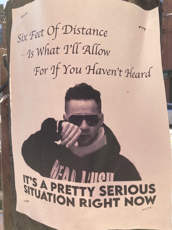 This is the text on the poster: "Six Feet Of Distance/ Is What I'll Allow/ For If You Haven't Heard/ IT'S A PRETTY SERIOUS SITUATION RIGHT NOW"
